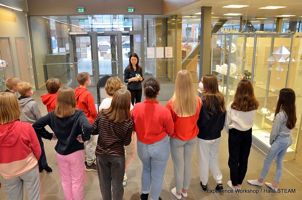 Origami artist Kaija Toivakka and the chairman of the Jyväskylä Finnish-Japanese Association, also known as a visual artist, Juhani Lillberg also took part in the event. Under their guidance, students got acquainted with the exhibition of Japanese art.