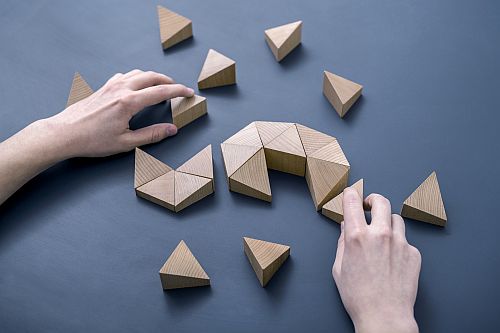 The Logifaces set is made up of 16 truncated prism blocks. The 16 pieces contain 11 different types of prisms, each of them identifiable by the height of their three vertices. The rule of the game is to build a continuous surface using up all blocks without leaving any gaps or breaks between them. The tool offers a nearly infinite logical complexity, complicated mathematical and geometrical problems.